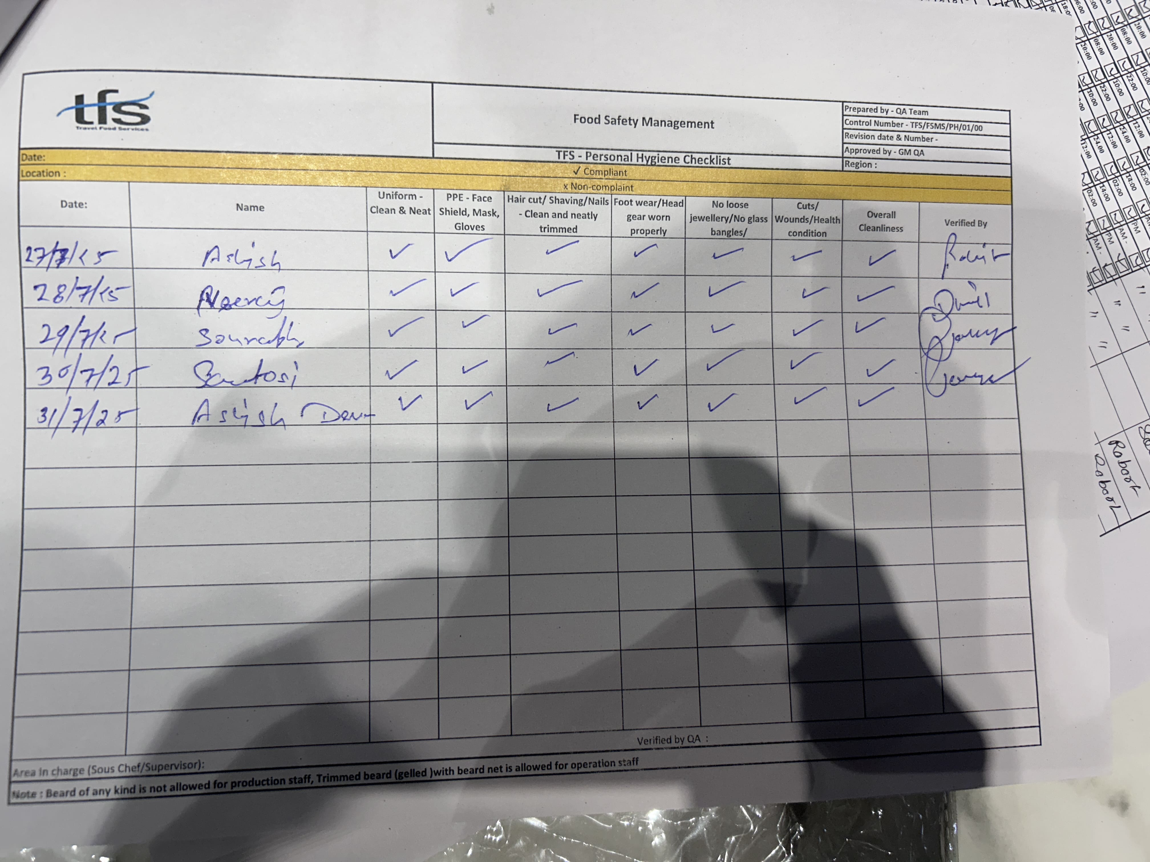 Food handlers maintain personal cleanliness (clean clothes, trimmed nails &water proof bandage etc.) and personal behaviour (hand washing, no loose jewellery, no smoking, no spitting etc.) |
